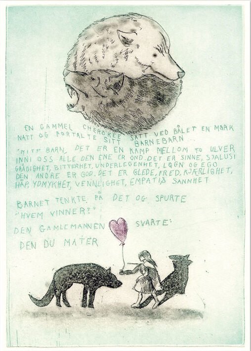 Jeg elsker den gamle indianerhistorien. Den er så enkel. Alle kan relatere seg til den, og forstå budskapet. Vi alle har både det gode og det vonde i oss, – og valget om hvem vi ønsker å være, uavhengig av de ulike forutsetningene vi har – er det opp til oss selv å ta.