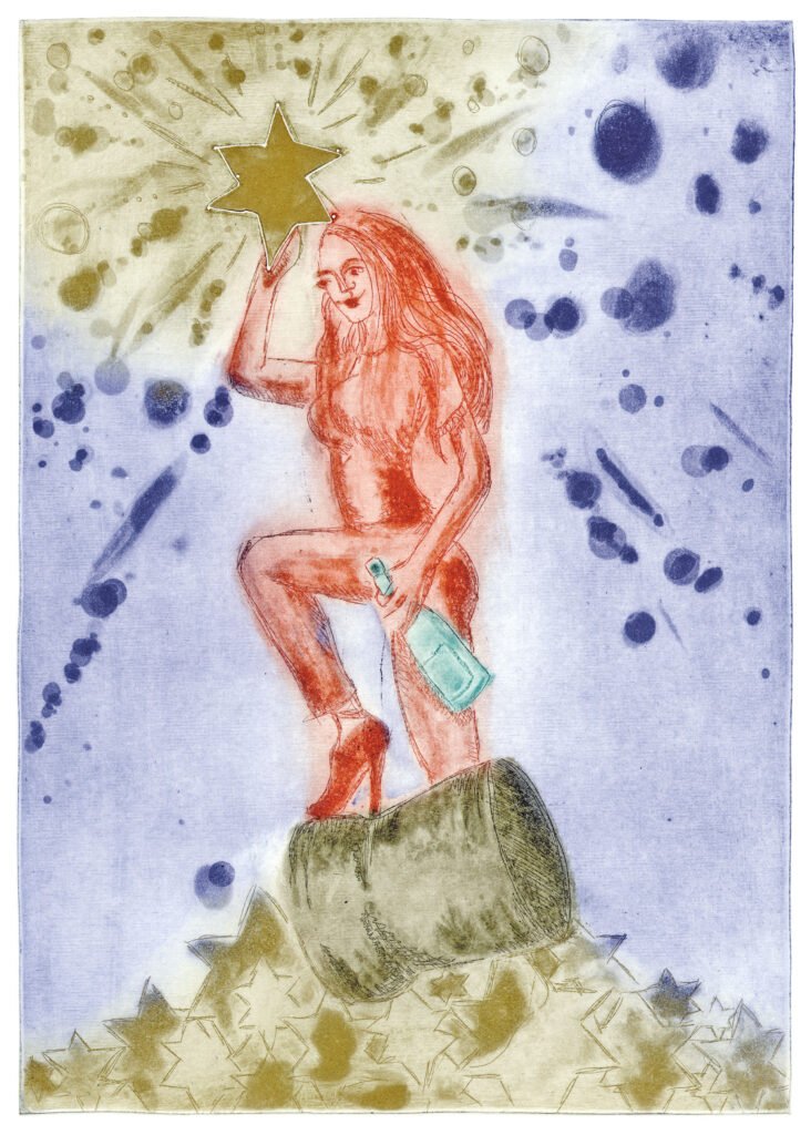 Hun holder en flaske med bobler, det er for å minne oss på viktigheten av å feire hver eneste varde vi passerer, hvert lille og viktige delmål. Flasken trenger ikke inneholde alkohol. Den er et symbol på feiring, og det viktige er at du verdsetter det du får til. Alle disse bittesmå skrittene på livets vei.