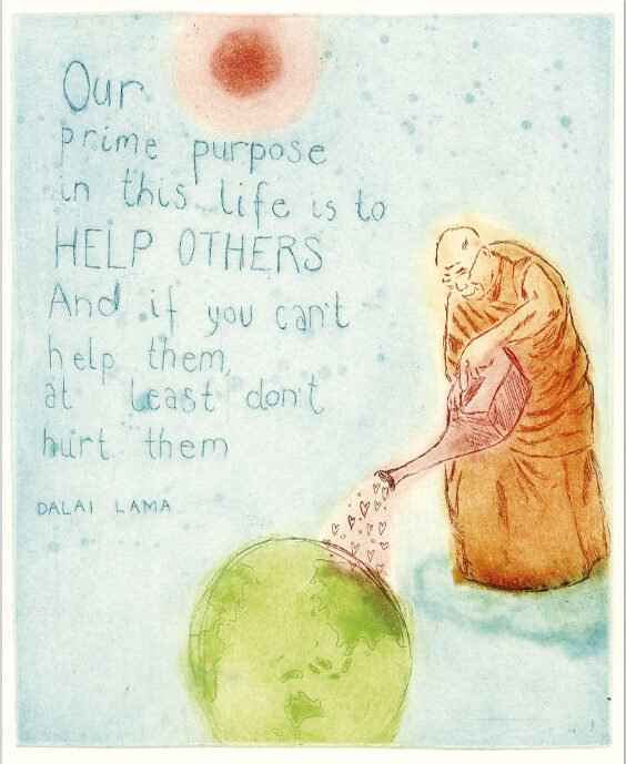 Jeg lagde et bilde av Dalai Lama som vanner jordkloden med kjærlighet. Med sin tankegang, med sin visdom og med den han er. Med at han ikke viser vold når andre kanskje ville vist vold. Han snur det andre kinnet til og viser kjærlighet. For meg er han et stort forbilde. Av alle mennesker i hele verden er han den jeg helst vil møte. Så jeg er litt misunnelig på min kjære venninne Helene Bøksle, som skal synge for ham så fort koronaen er over.